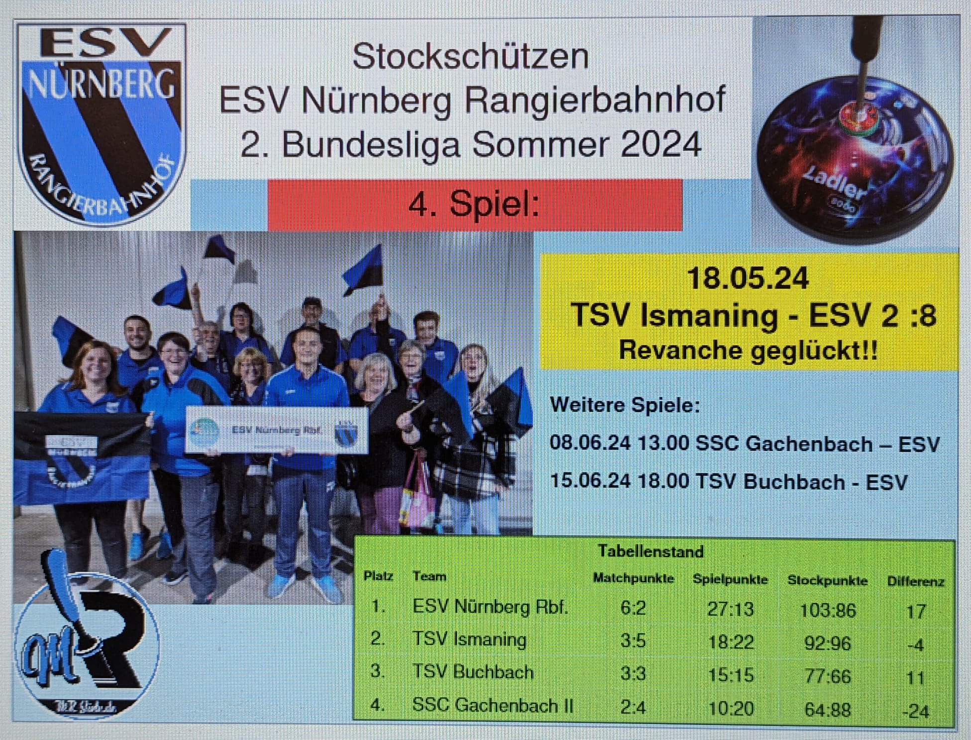 Der ESV Nürnberg Rbf. reist somit mit einem guten Gefühl zu den beiden Auswärtsspielen am 08.06.24 zum SSC Gachenbach II und am 15.06.24 zum TSV Buchbach.