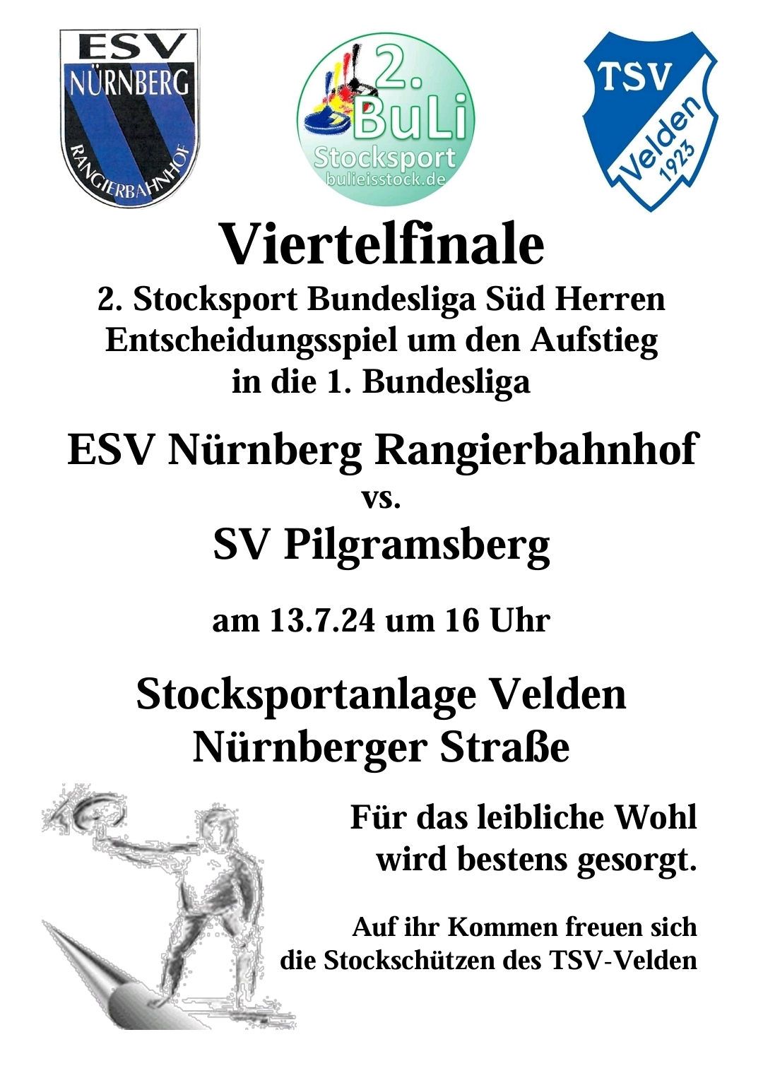 am 13.7.24 findet in Velden das Viertelfinale der 2. Bundesliga Herren zwischen dem ESV Nürnberg-Rangierbahnhof und dem SV Pilgramsberg statt.